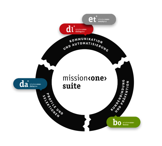 you can build the perfect customer journey. Each product can be used as a stand-alone solution or as a supplement to existing systems. In addition, all modules of the mission‹one› suite are cloud-based and can be operated by you via a web browser without any installation effort.